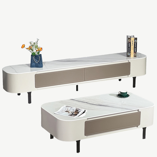 TV-Meubel en salontafel met marmer en leer - (ivoorwit) set van 2 stuks