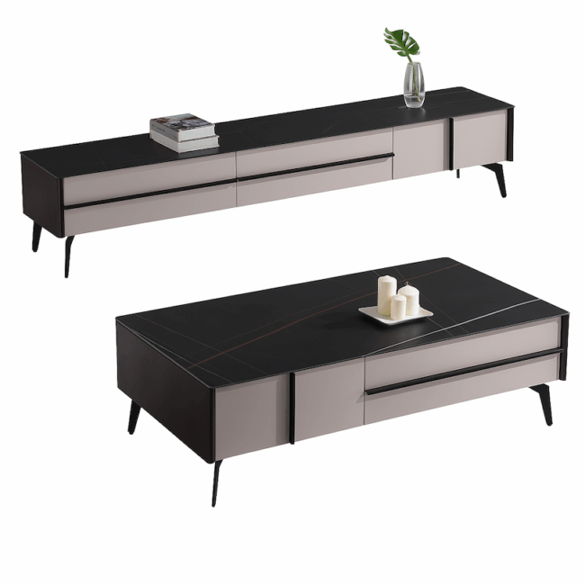 TV-meubel en salontafel in marmerlook - keramiek (zwart) set van 2 stuks