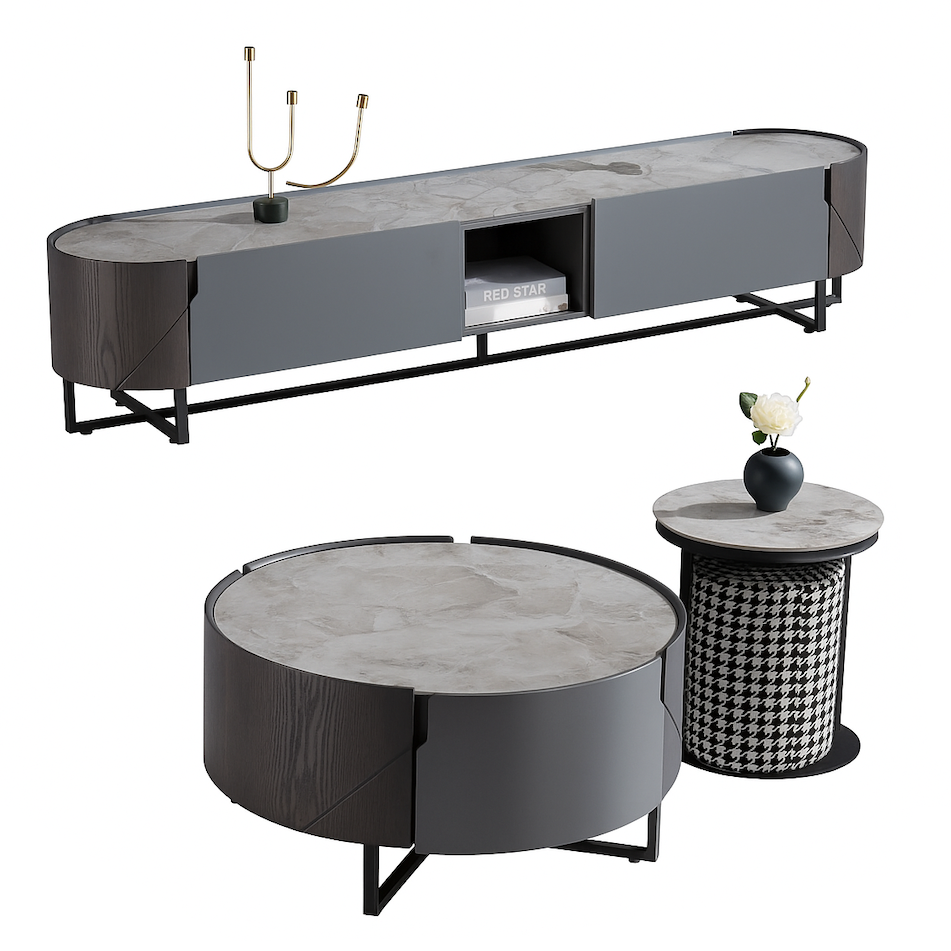 4-Delige woonkamerset met donkergrijs stenen blad en houtfineer (TV-meubel, salontafel en bijzettafel) + GRATIS poef