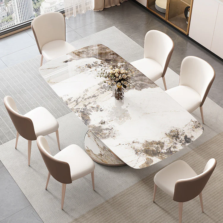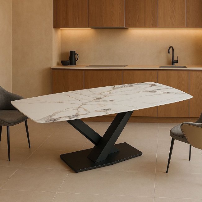 Deens ovale eettafel - Calacatta met V-poot onderstel